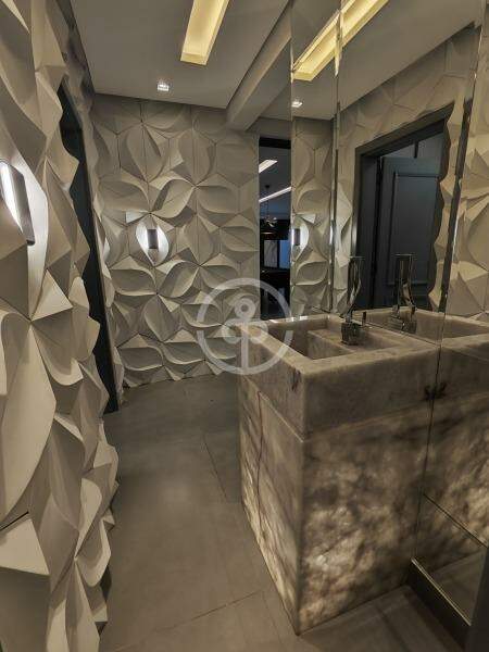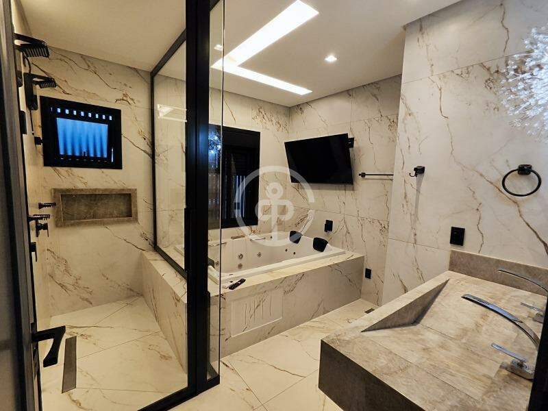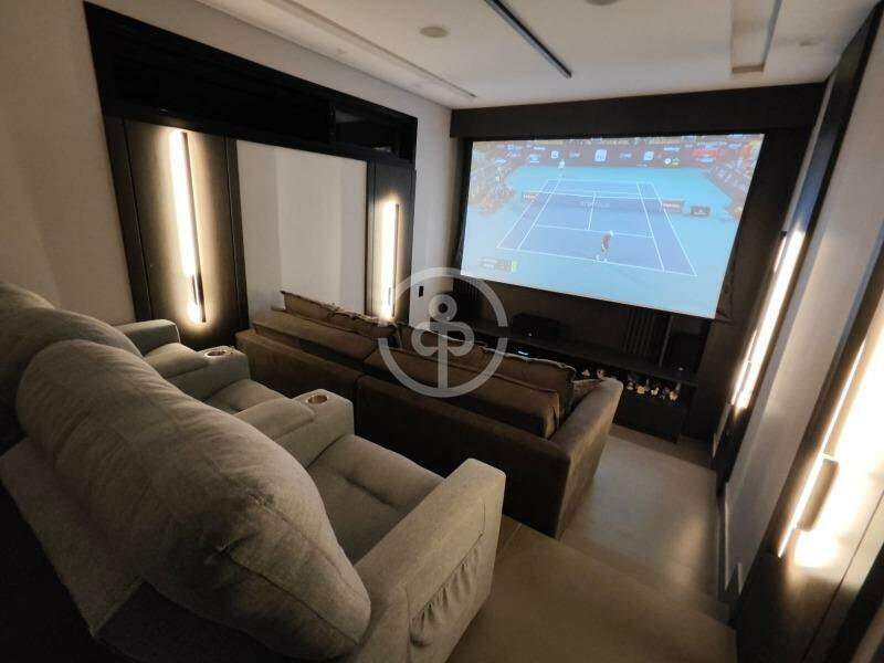 A casa conta com 8 Smart TVs, 7 ar-condicionados Inverter, sala de cinema com telão de 120" e projetor WemaxGo 1080p, além de som ambiente JBL com receivers Denon.